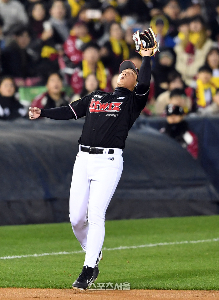 KT 위즈 황재균이 8일 잠실구장에서 열린 2023 KBO리그 LG 트윈스와 한국시리즈 2차전 1회말 무사 LG 홍창기의 뜬공을 잡아내고 있다. 2023. 11. 8. 잠실 | 박진업기자 upandup@sportsseoul.com