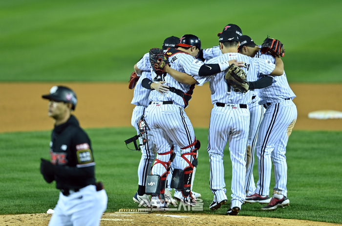 LG 고우석, 박동원 등 내야수들이 8일 잠실구장에서 열린 2023 한국시리즈 LG트윈스와 KT위즈의 경기에서 승리한 후 선수들과 자축하고 있다. 2023.11.08. 잠실 | 강영조기자 kanjo@sportsseoul.com