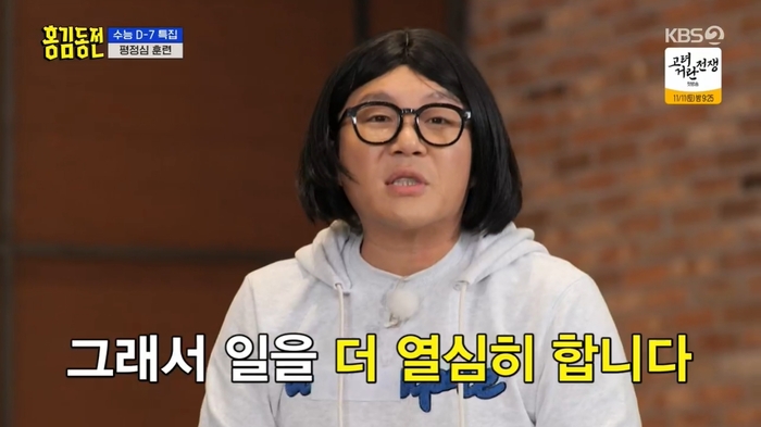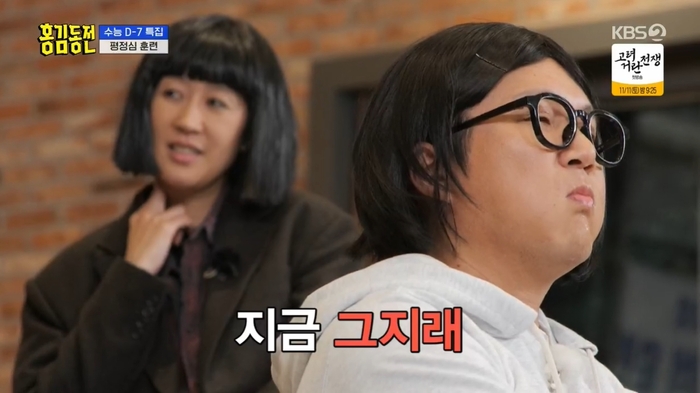 9일 방송된 KBS2 ‘홍김동전’에는 수능 대비 훈련 특집으로 1교시 논술시험, 2교시 평정심 훈련, 3교시 영어 영역을 치르는 모습이 전파를 탔다.