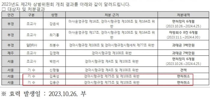 한국마사회는 지난달 말 2023년도 제2차 상벌위원회 개최결과를 발표했다. 조교사 4명과 말관리사 1명, 기수 3명에 대한 징계가 내려졌다. 김옥성 기수와 김용근 기수에게는 면허취소라는 중징계가 내려졌다.