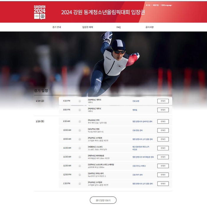 [스포츠서울 | 김용일기자] 2024 강원 동계청소년올림픽 입장권 예매가 11일 오전 11시11분 예매 사이트(tickets.gangwon2024.org)에서 시작한다.