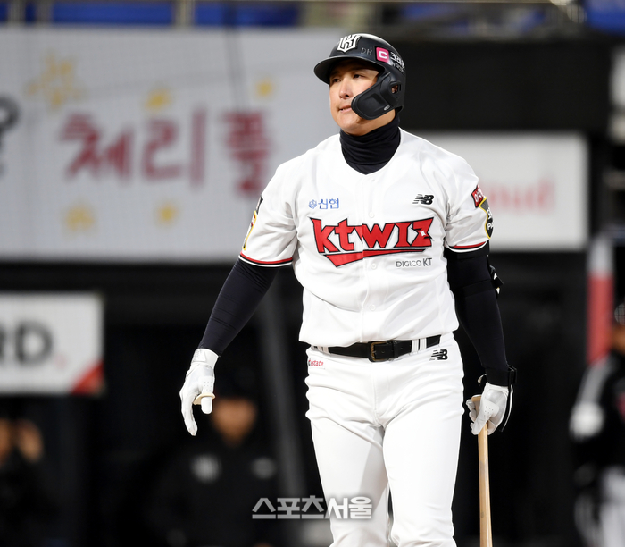 KT 황재균이 10일 수원 KT위즈파크에서 열린 LG와 2023 한국시리즈 3차전 1회말 무사1,2루 헛스윙 삼진아웃을 당한 후 아쉬워하고 있다. 2023. 11. 10. 수원 | 최승섭기자 thunder@sportsseoul.com