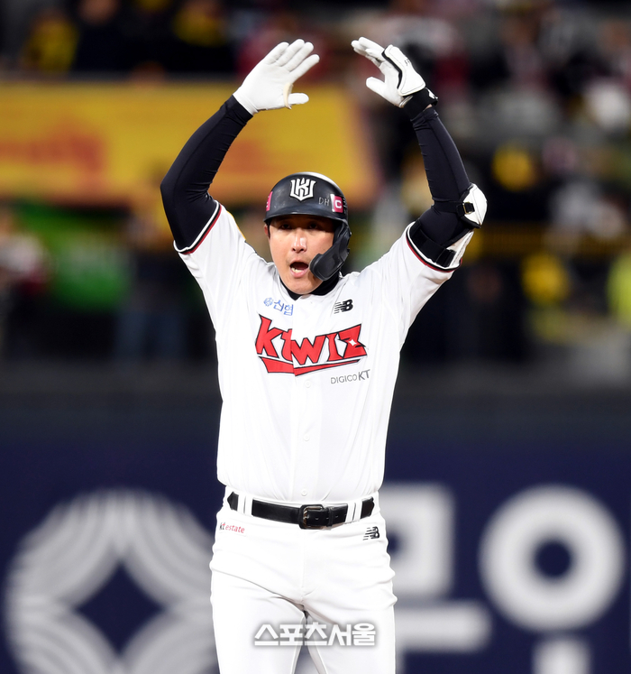 KT 황재균이 10일 수원 KT위즈파크에서 열린 LG와 2023 한국시리즈 3차전 3회말 무사1,2루 1타점 좌중간 2루타를 친 후 환호하고 있다. 2023. 11. 10. 수원 | 최승섭기자 thunder@sportsseoul.com