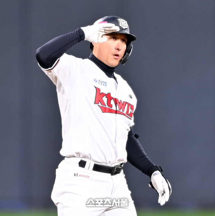 KT 3번타자 황재균이 10일 수원KT위즈파크에서 열린 2023KBO리그 LG트윈스와 KT위즈의 한국시리즈 3차전 3회말 무사 1,2루에서 1타점 2루타로 출루하고 있다. 2023.11.10. 수원 | 강영조기자 kanjo@sportsseoul.com