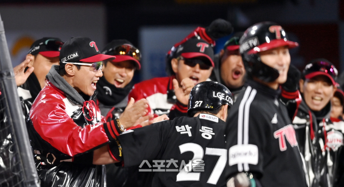 LG 7번타자 박동원이 10일 수원KT위즈파크에서 열린 2023KBO리그 LG트윈스와 KT위즈의 한국시리즈 3차전 6회초 무사 1루에서 손동현을 상대로 좌월2점 역전홈런을 터트린 후 홈인하고 있다.2023.11.10. 수원 | 강영조기자 kanjo@sportsseoul.com