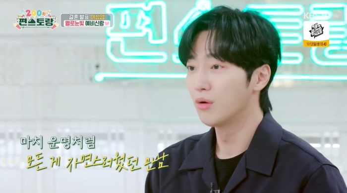 이상엽은 “자연스럽게 밥을 먹고 있었고, 자연스럽게 식장 예약도 하고 있었고, 자연스럽게 드레스를 보러 가고 있었다”라며 운명과도 같은 러브 스토리를 전했다.