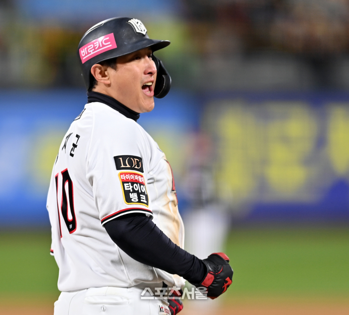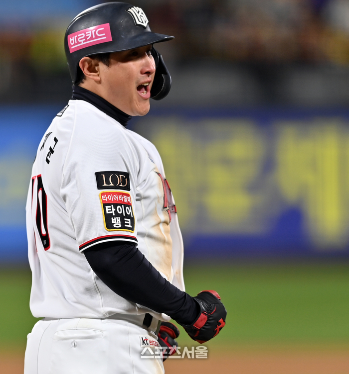 KT 4번타자 박병호가 10일 수원KT위즈파크에서 열린 2023KBO리그 LG트윈스와 KT위즈의 한국시리즈 3차전 8회말 고우석을 상대로 2점홈런을 터트린 후 홈인하고 있다. 2023.11.10.