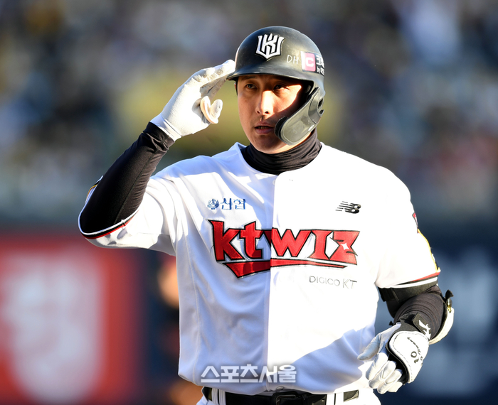 KT 황재균이 11일 수원 KT위즈파크에서 열린 LG와 2023 한국시리즈 4차전 6회말 2사2루 1타점 좌전안타를 친 후 세리머니를 하고 있다. 2023. 11. 11. 수원 | 최승섭기자 thunder@sportsseoul.com