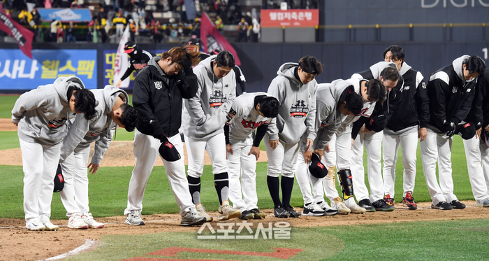 KT 위즈 선수들이 11일 수원 KT위즈파크에서 열린 2023 KBO리그 LG 트윈스와 한국시리즈 4차전에서 패한 뒤 팬들에게 인사를 하고 있다. KT는 한국시리즈 1차전 승리 후 3연패에 빠졌다. 2023. 11. 11. 수원 | 박진업기자 upandup@sportsseoul.com
