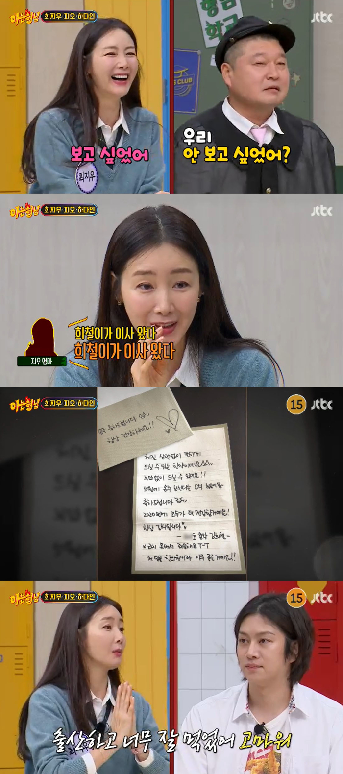 최지우는 뜻밖에 김희철과도 인연이 있었다. 최지우는 “어느날 엄마 집에 갔더니 ‘희철이가 이사 왔다’더라. 엄마 윗집에 이사를 온거다. 엄마한테 너무 잘했다”라고 말했다.