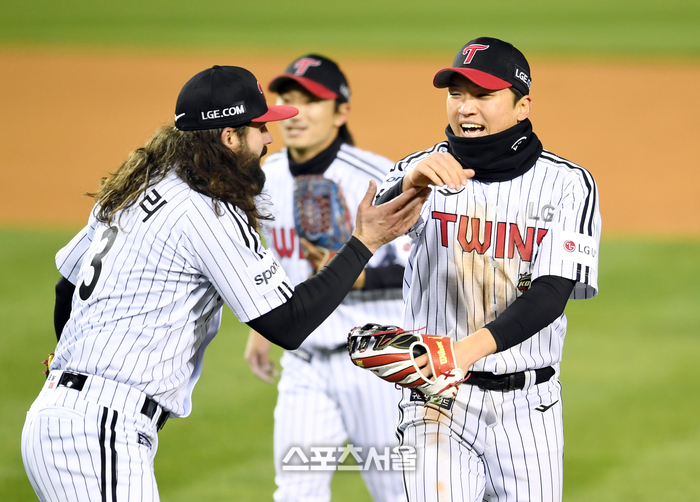 LG 트윈스 박해민(오른쪽)이 13일 잠실구장에서 열린 2023 KBO리그 KT 위즈와 한국시리즈 5차전 4회초 2사 1-2루 상황에서 KT 김민혁의 타구를 다이빙 캐치한 뒤 선발투수 켈리와 함께 기뻐하고 있다. 2023. 11. 13. 잠실 | 박진업기자 upandup@sportsseoul.com