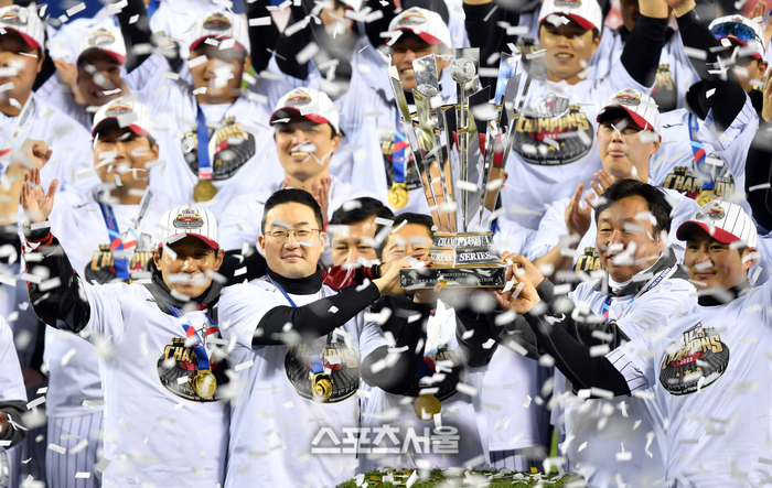 한국시리즈 4승 1패로 우승을 차지한 LG 선수들이 13일 잠실구장에서 열린 2023 KBO리그 LG트윈스와 KT위즈의 한국시리즈 5차전을 마치며 세리머니를 펼치고 있다. 구광모 회장이 염경엽 감독, 차명석 단장, 주장 오지환과 트로피세리머니를 펼치고 있다. 2023.11.13. 잠실 | 강영조기자 kanjo@sportsseoul.com
