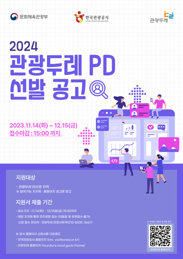 접수 기간은 14일부터 12월 15일 오후 3시까지다. 접수는 해당 지자체 공식 전자공문(이메일 및 우편접수 불가)으로 하면 된다. 서류전형 합격 발표는 12월 21일, 종합평가는 내년 1월 5일에 진행해, 최종 합격자는 1월 9일 발표할 예정이다. 더 자세한 사항은 관광두레 누리집 및 공사 공식 누리집에서 확인할 수 있다.