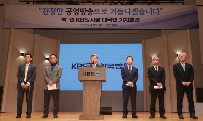 박민 사장은 14일 오전 서울 영등포구 여의도동 KBS 신관 아트홀에서 열린 대국민 기자회견에서 경영정상회를 위한 임원임금 삭감, 일부 보도 프로그램 책임자들의 인사단행 경위 등을 설명했다. 이 자리에는 박민 사장을 비롯해 이춘호 전력기획실장, 김동윤 편성본부장, 장한식 보도본부장, 임세형 제작1본부장, 조봉호 경영본부장이 참석했다.