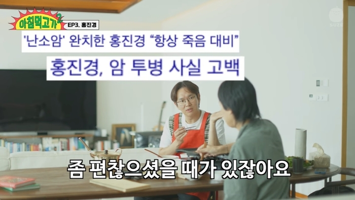 집을 찾아온 장성규는 홍진경과 대화를 나누다 과거 홍진경의 난소암 투병을 언급했다.