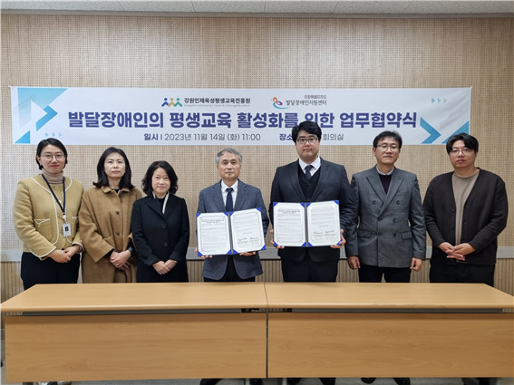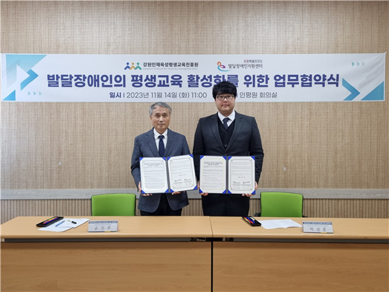 [스포츠서울ㅣ춘천=김기원기자] 강원인재육성평생교육진흥원(원장 손인주)은 지난 14일, 강원인재육성평생교육진흥원 회의실에서 강원특별자치도발달장애인지원센터(센터장 박성준)와 함께 발달장애인의 평생교육 활성화를 위한 업무협약을 체결했다.