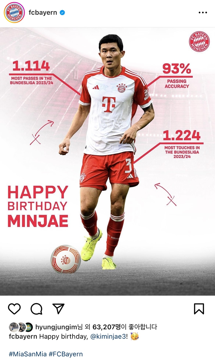 [스포츠서울 | 정다워기자] 바이에른 뮌헨이 김민재의 생일 축하하며 응원의 메시지를 보냈다.