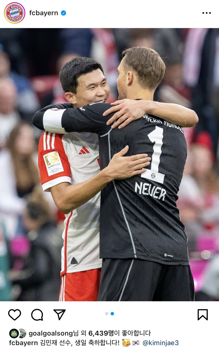 바이에른 뮌헨은 15일 구단 공식 인스타그램 계정에 김민재의 생일을 축하하는 게시물을 두 개 올렸다. 하나는 한글로 “김민재 선수, 생일 축하합니다!”라며 김민재가 골키퍼 마누엘 노이어와 포옹을 하는 사진을 두 장 첨부했다. 또 다른 게시물은 영어로 “Happy birthda”라며 이번시즌 김민재의 기록을 강조해 김민재가 충분히 좋은 활약을 하고 있다는 점을 상기시켰다.
