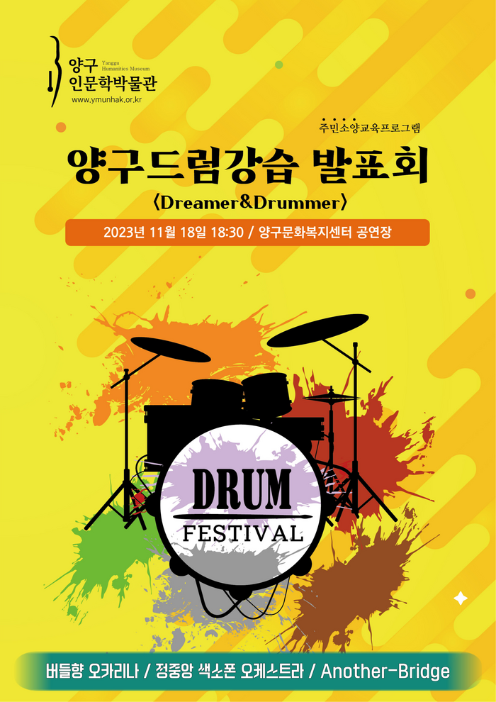 [스포츠서울ㅣ김기원기자] 양구인문학박물관은 오는 18일 오후 6시 30분 양구문화복지센터 공연장에서 ‘양구 드럼 강습 발표회 <Dreamer&Drummer>’를 개최한다.