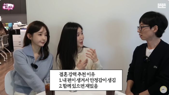 이해리는 “저는 너무 좋다. 결혼 강추”라고 답했다. 결혼을 추천하는 이유에 대해 “안정감이 많이 생기고 이제 내 편이 생겼다. 말이 잘 통해서 재밌고 웃긴다”라고 밝혔다.
