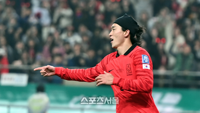 싱가포르는 한국계 귀화 선수 송의영을 앞세워 종종 역습을 펼치다가 전반 막판엔 아예 수비 지역으로 내려와 철통 방어를 펼쳤다. 전반을 무실점으로 마치려는 의도가 보였다. 하지만 이때 한국은 허를 찔렀다. 전반 44분 이강인이 페널티박스 오른쪽에서 차 올린 공을 조규성이 달려들며 왼발 논스톱 슛으로 골문을 갈랐다. 6만4381명 만원 관중이 환호했다.