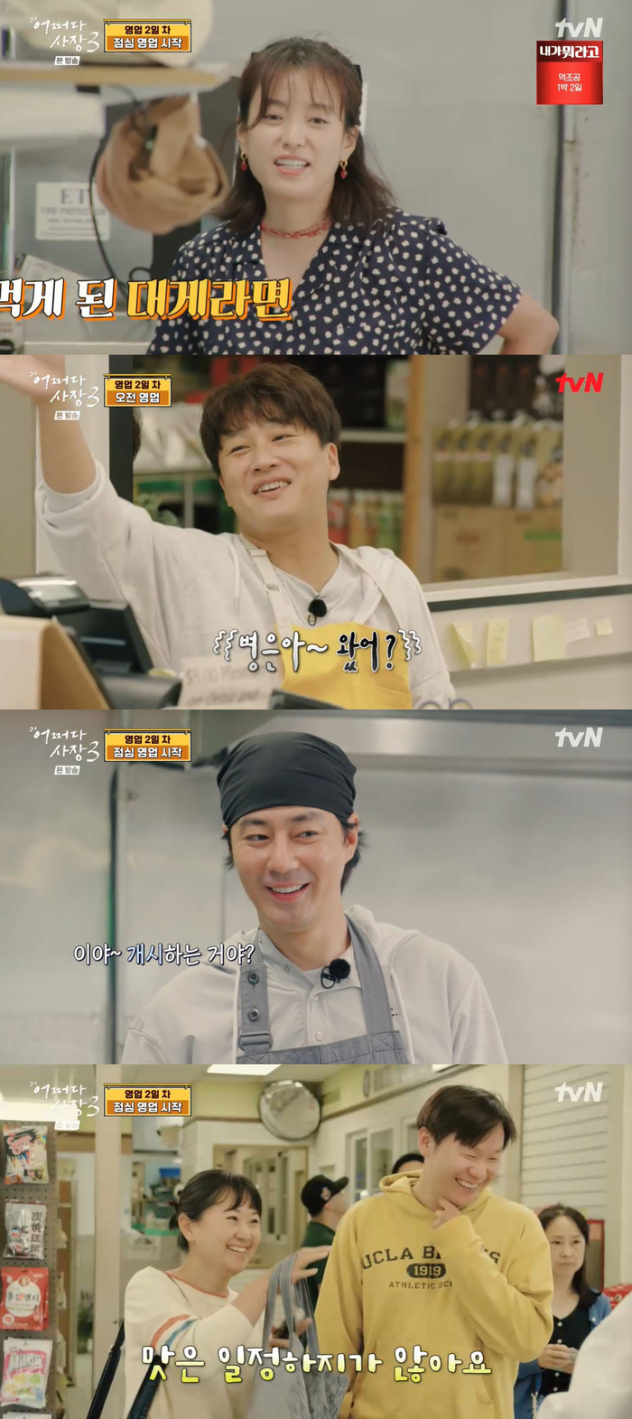 차태현은 “여기 원래 사장님이 김밥을 파셔서 저희도 팔았는데 너무 많이 사러오시고, 너무 많이 팔았다”라며 고충을 호소했다. 이 와중에 한참이나 옆에 앉아 얘기를 나누던 손님이 “근데 어디서 많이 보던 분 같다”라고 하자 차태현은 “그렇죠. 제가 배우니까”라고 답해 손님의 동공지진을 불렀다.