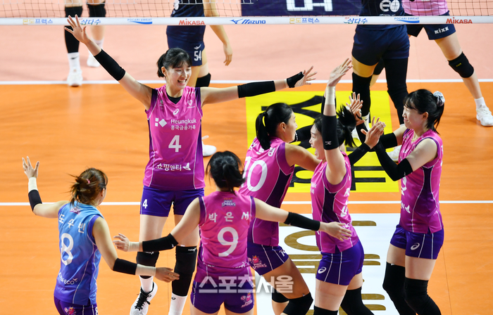 흥국 김미연이 17일 인천 삼산월드체육관에서 열린 2023-2024 도드람V리그 여자부 흥국생명(1위 7승1패)와 GS칼텍스(2위 6승2패) 경기에서 1세트 마지막득점을 블로킹으로 따낸 후 환호하고 있다. 2023.11.17. 인천 | 강영조기자 kanjo@sportsseoul.com