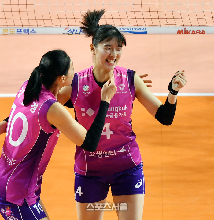 흥국 김연경이 17일 인천 삼산월드체육관에서 열린 2023-2024 도드람V리그 여자부 흥국생명(1위 7승1패)와 GS칼텍스(2위 6승2패) 경기에서 1세트 블로킹 득점한 이주아와 환호하고 있다. 2023.11.17. 인천 | 강영조기자 kanjo@sportsseoul.com