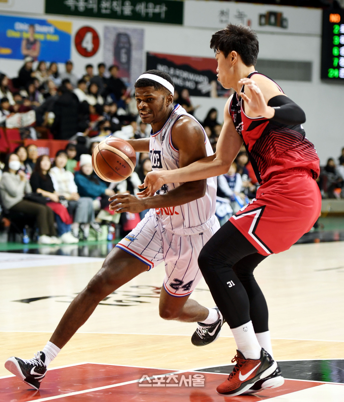 부산 KCC 존슨이 19일 안양실실내체육관에서 열린 2023-2024 프로농구 안양 정관장과 경기에서 상대 수비를 뚫고 드리블을 하고 있다. 2023. 11. 19. 안양 | 최승섭기자 thunder@sportsseoul.com