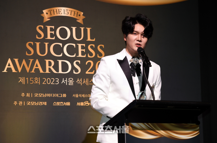 트로트대상을 수상한 가수 신인선이 20일 그랜드 하얏트 서울에서 열린 ‘제15회 2023 서울 석세스 대상’에서 소감을 밝히고 있다.