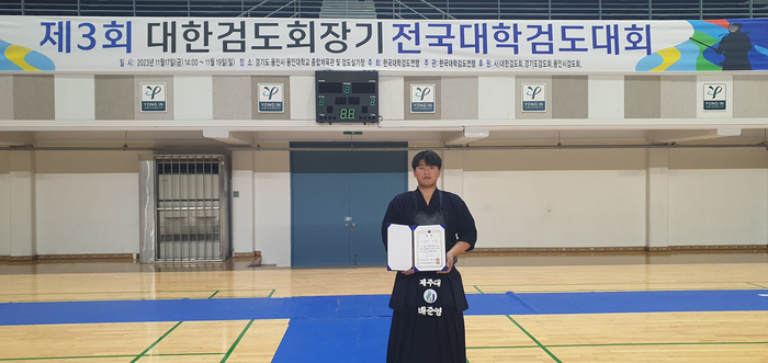 배준영 선수의 제3회 대한검도회장기 전국대학교검도대회 남자대학 통합부 개인전 준우승 입상으로 제주검도의 상승세를 이어가고 있다.