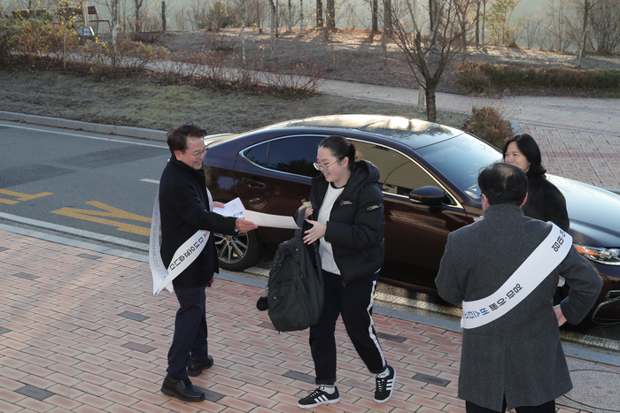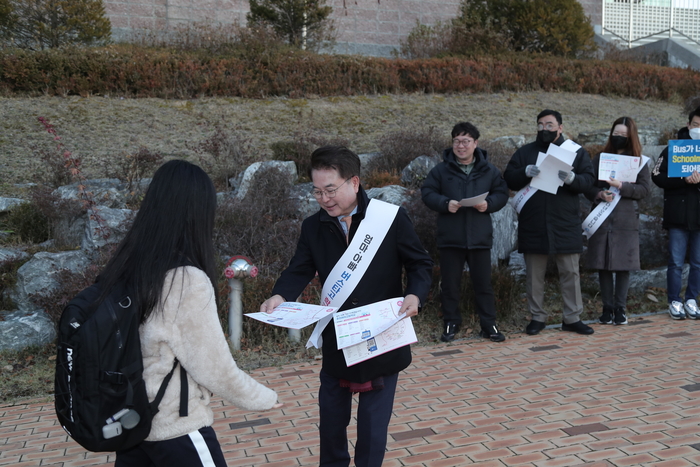 [스포츠서울ㅣ춘천=김기원기자] 춘천시가 21일 오전 7시 40분 춘천 내 8개 고등학교 통학로에서 통학 급행 버스 홍보에 나섰다.