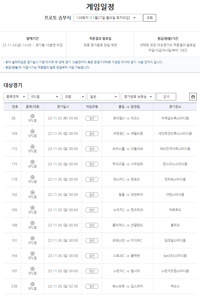 챔피언십 리그 대상 경기는 오는 24일 오후 2시부터 발매를 개시하는 프로토 승부식 138회차 및 프로토 기록식 99회차부터 즐길 수 있으며, 앞으로 발행되는 프로토와 토토 게임에 점점 확대 적용할 예정이다.