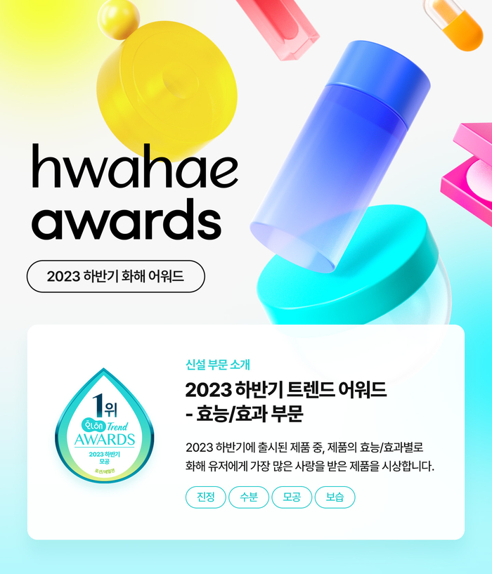 특히, 화해는 2023년 1월 마스크 착용 의무 해제 후 화장품업계 매출이 상승한 가운데 특히 주목도가 높아진 피부 고민, 기대 효과별 인기 제품을 선정하기위해 ‘효능·효과’ 부문을 신설했다. △수분 △보습 △모공 △진정 분야별로 소비자에게 가장 높은 평가를 받은 제품 순으로 후보군을 정해 총 18개의 수상 제품을 최종 심사 후 선정했다.