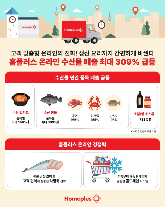 홈플러스는 특히 식사를 간편하게 즐기려는 추세가 확대되면서 밀키트와 수산물 매출이 지난해보다 크게 늘어났다고 말했다. 홈플러스 온라인 고객 데이터에 따르면, 수산물을 주재료로 한 알탕·대구탕·해물탕 등 밀키트 품목의 1~10월 매출이 지난해 같은 기간 대비 87% 뛰고 품목별로는 최대 146% 높아졌다.