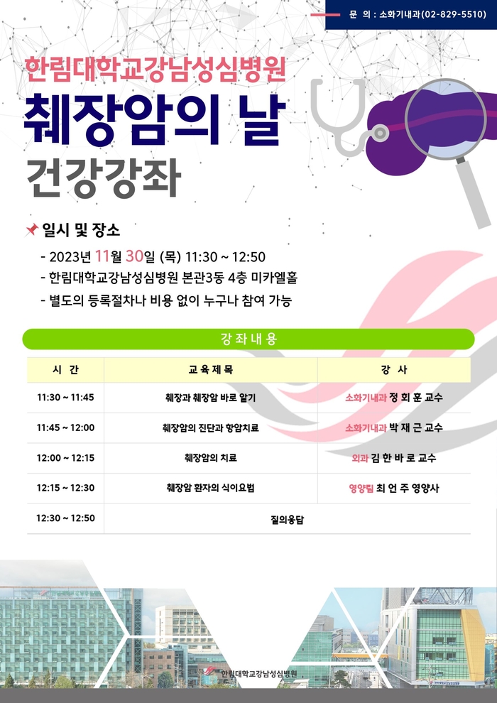 [스포츠서울 | 황철훈기자] 한림대강남성심병원이 오는 30일 세계 췌장암의 날을 맞아 본관 3동 미카엘홀에서 건강강좌를 연다.