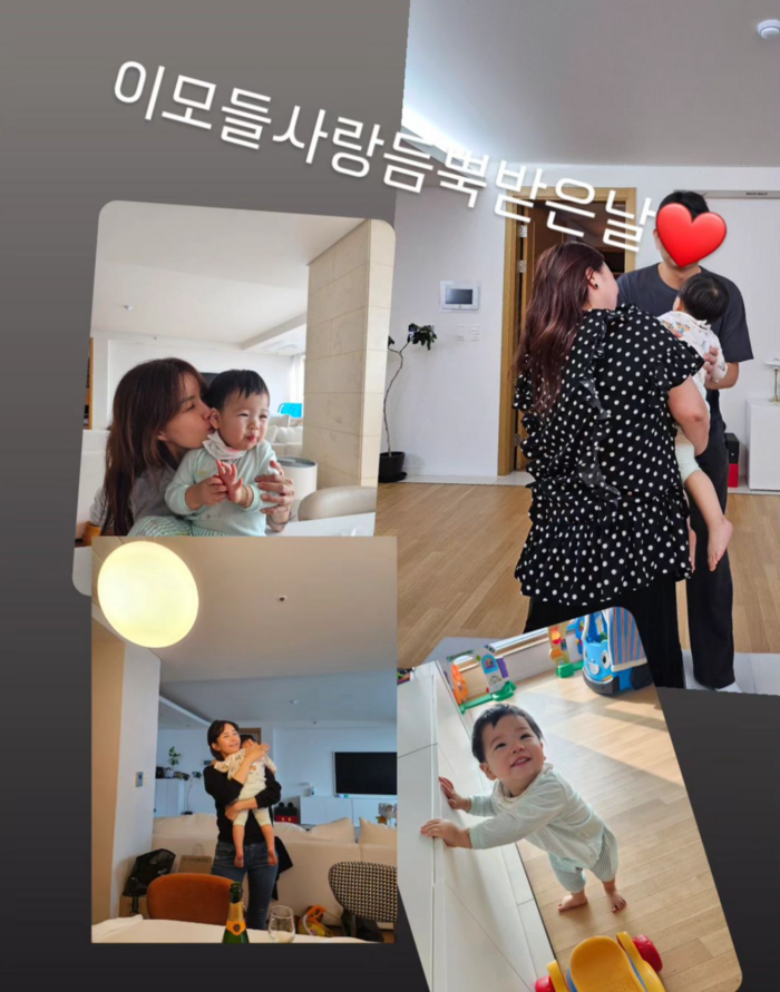 사진 속에는 배우 신애라와 방송인 장영란이 준범이와 즐거운 시간을 보내고있다. 특히 활짝 웃는 준범이 볼에 뽀뽀를 하거나 이유식을 먹여주는 등 준범이를 향한 이모들의 넘치는 사랑이 느껴진다.