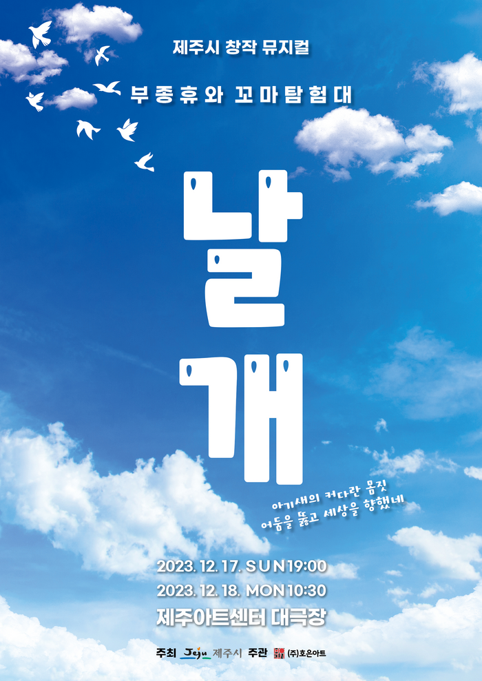 [스포츠서울ㅣ김기원기자] 제주시는 창작뮤지컬 <부종휴와 꼬마탐험대 ‘날개’> 공연을 제주아트센터에서 오는 12월 17일 (일) 오후 7시, 18일(월) 오전 10시 30분 이틀에 걸쳐 총 2회 선보인다.