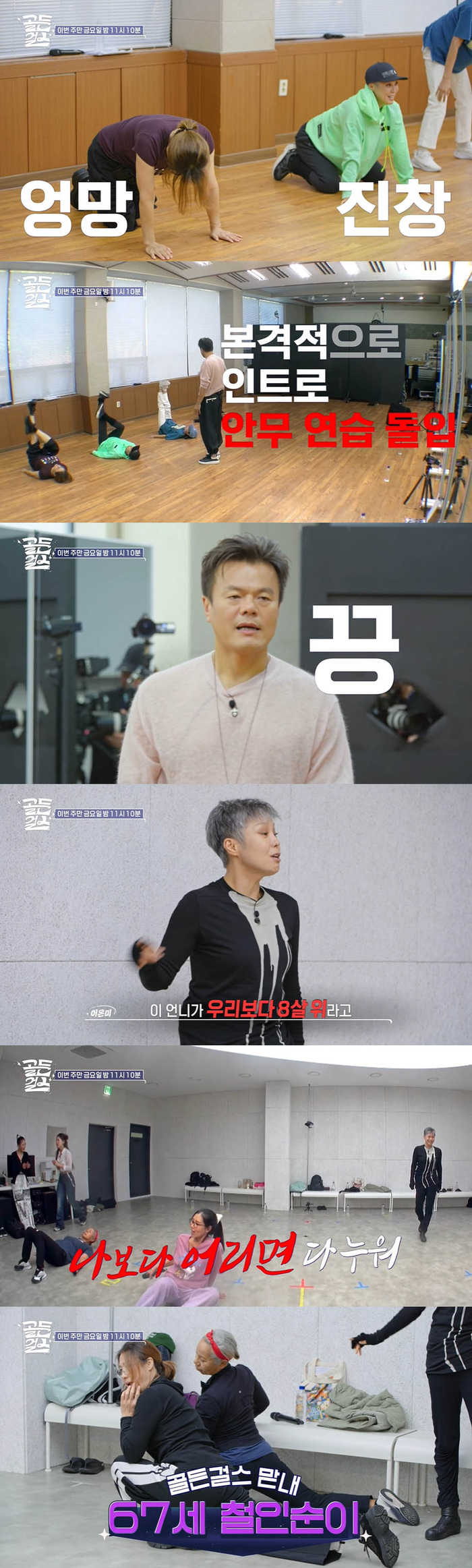 멤버들의 연습이 이어지는 가운데, 최연장자인 67세 인순이가 ‘철인순이’라는 별명답게 솔선수범 안무 연습에 나서 “나보다 어리면 다 누워”라고 호령했다.