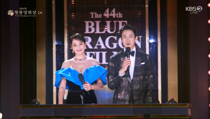 밝은 파랑 하트 장식의 오프숄더 드레스를 입은 김혜수는 환한 미소로 청룡영화상을 소개했다.