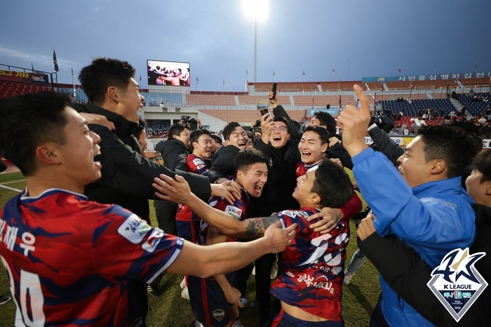김천 상무는 안방에서 축제의 장을 펼쳤다. 김현욱의 선제 결승골로 서울 이랜드를 제압한 후 나란히 그라운드 위에 모여 부산의 경기를 전광판으로 지켜봤다. 그리고 충북청주의 동점골을 비롯해 경기 종료 휘슬이 울리자 서로를 얼싸안고 포효했다. 이로써 김천은 2022시즌 K리그1 11위로 대전 하나시티즌과 승강 플레이오프서 패해 강등된 이후 2년 만에 K리그1 무대를 밟게 됐다.