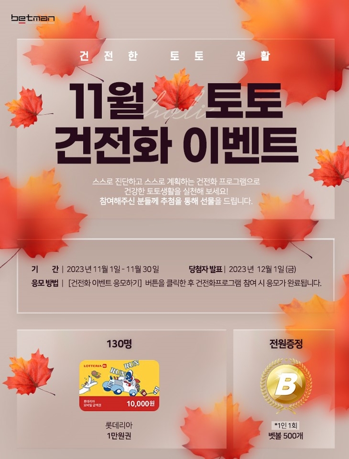 이번 이벤트는 오는 30일까지 참여할 수 있으며, 당첨자는 12월 1일에 공지된다. 자세한 내용은 베트맨 내 이벤트 페이지에서 확인할 수 있다. et16@sportsseoul.com