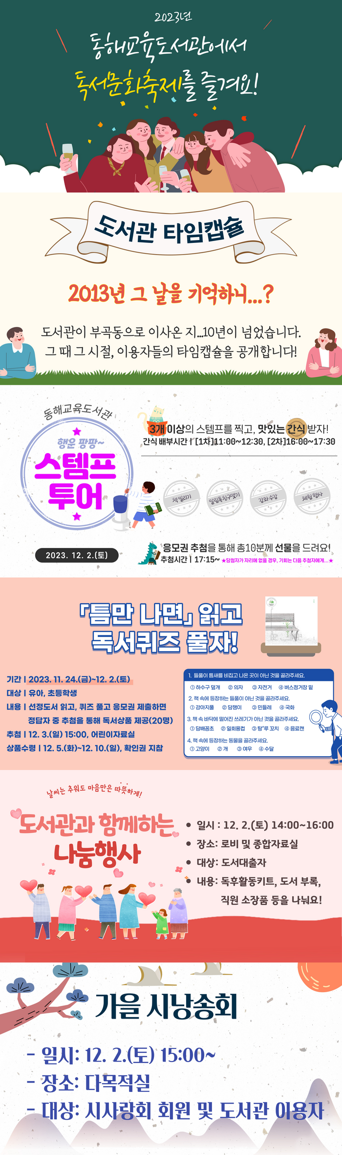 2023년 독서문화축제에 대한 자세한 내용은 동해교육도서관 사무실(☎533-4438)로 문의하면 된다.