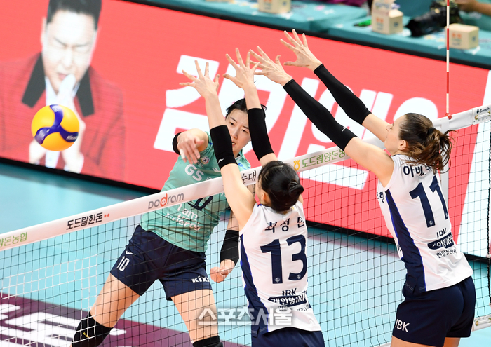 GS칼텍스 강소휘(왼쪽)가 29일 장충체육관에서 열린 2023-2024 V리그 여자부 IBK기업은행과 경기에서 스파이크 공격을 하고 있다. 2023. 11. 29. 박진업기자 upandup@sportsseoul.com