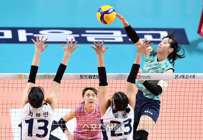 GS칼텍스 유서연(오른쪽 위)가 29일 장충체육관에서 열린 2023-2024 V리그 여자부 IBK기업은행과 경기에서 스파이크 공격을 하고 있다. 2023. 11. 29. 박진업기자 upandup@sportsseoul.com