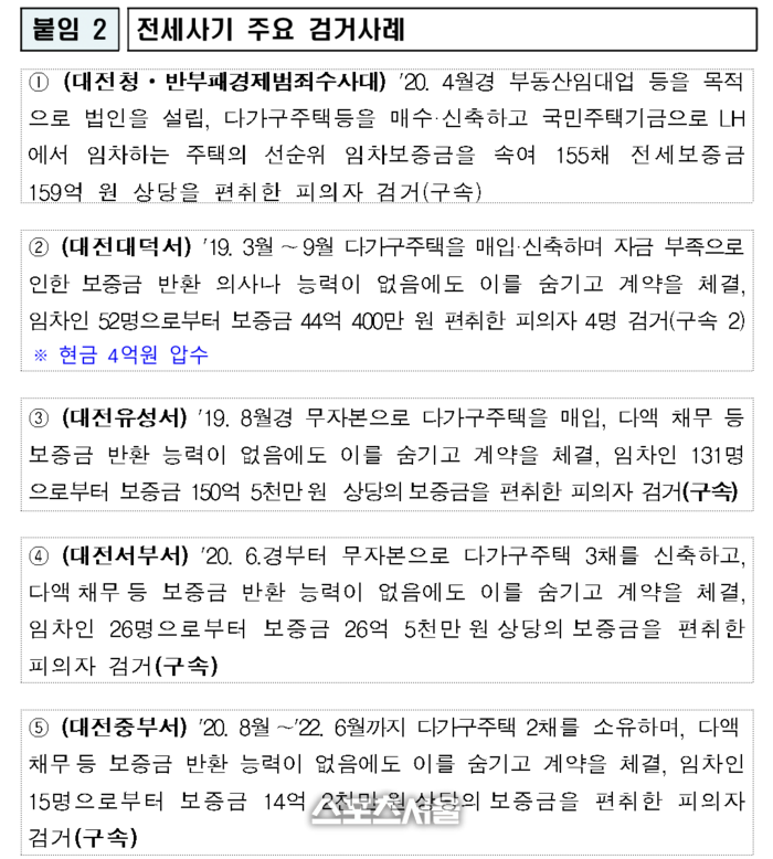 경찰청 관계자는 ‘점점 확산되고 있는 전세사기 관련, 피해자들은 연일 신속 수사 및 대책 마련을 촉구함에 따라 대전경찰은 시경찰청 중심으로 전략적 검거체제를 구축, 전세사기 범죄에 신속·엄정하게 대응하는 동시에 피해자 보호·지원에도 최선을 다하고 있다’ 설명했다.