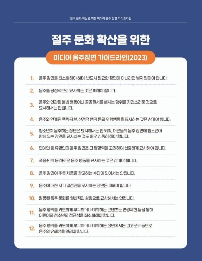 추가된 두 가지 항목은 ‘음주 행위를 과도하게 부각하거나 미화하는 콘텐츠는 연령 제한 등을 통해 어린이와 청소년의 접근성을 최소화해야 한다’와 ‘경고 문구 등으로 음주의 유해성을 알려야 한다’이다.