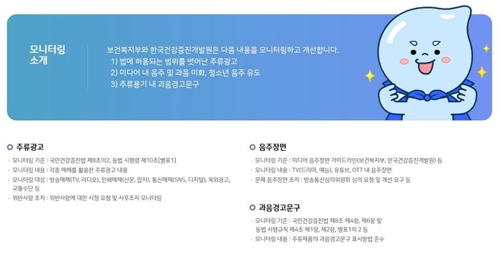 또한 한국건강증진개발원 ‘절주온(ON)’ 홈페이지에 따르면 모니터링 대상은 법에 허용되는 범위를 벗어난 주류광고, 미디어 내 음주 및 과음 미화와 청소년 음주 유도, 주류용기 내 과음 경고 문구다.