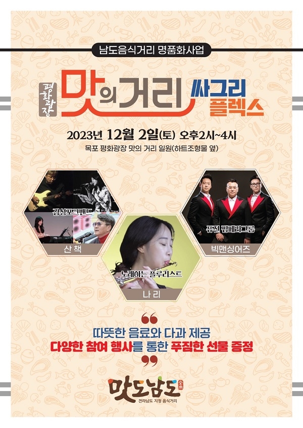 이번 행사는 「싸그리 플렉스」를 주제로 평화광장 맛의 거리 일원을 돌며 시민· 관광객 참여 기획 행사와 대중적인 길거리 공연(포크밴드 산책, 플루리스트 나리, 퓨전 팝페라 가수 빅맨 싱어즈)으로 진행되는 ‘싸그리 페스티벌’로 진행될 예정이다.