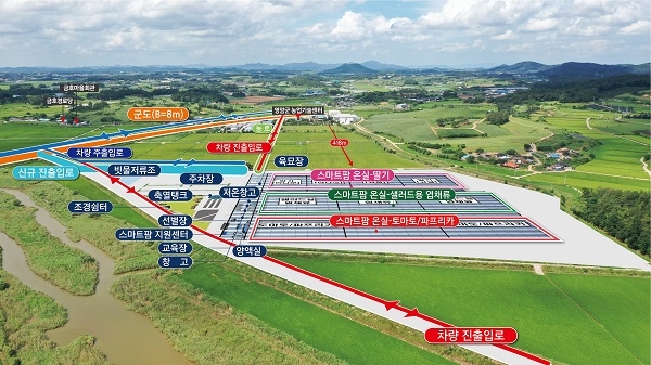 스마트팜에는 생산량 증대와 작업 효율성, 재배작목 전환 용이성 등을 고려해 최첨단 시설을 갖춘 유리온실 10동이 들어선다.
